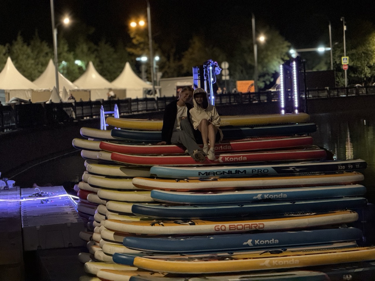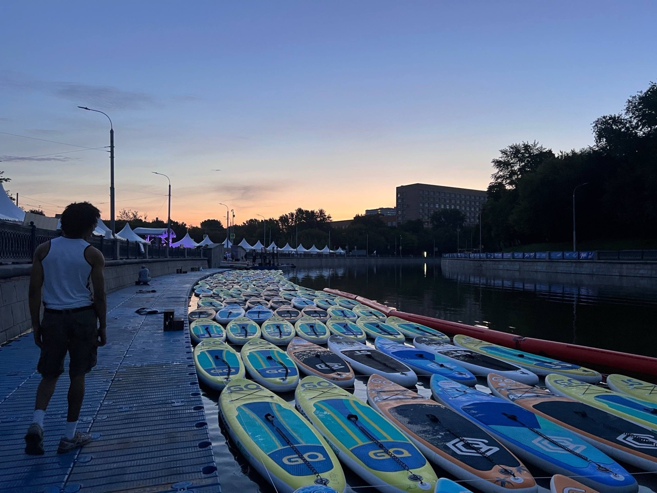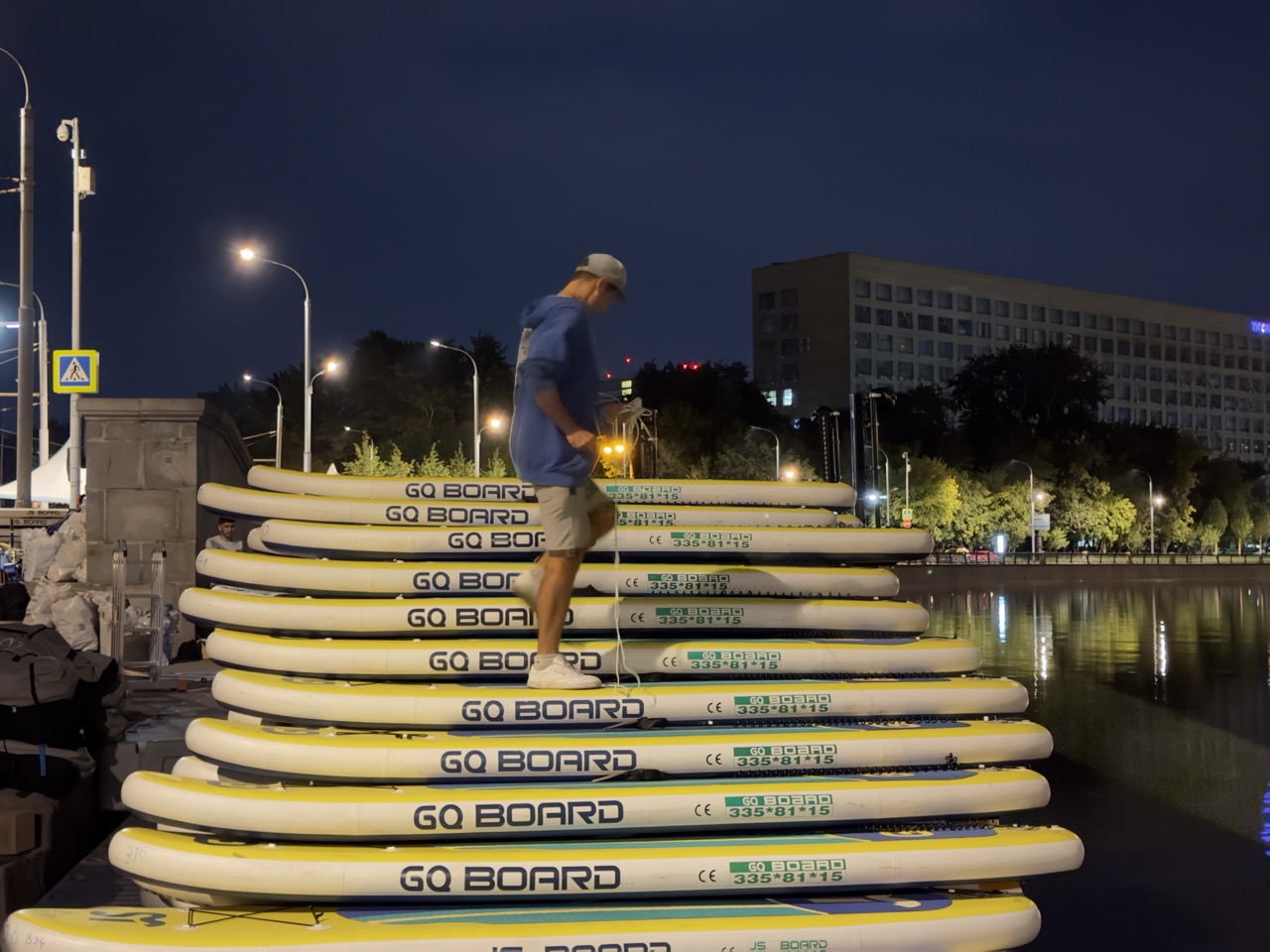 Пока город спал, мы разгружали машины с нашими досками — всеми этими тысячами сапов, которые наутро должны были оказаться в руках гостей. При свете прожекторов мы собирали конструкции для сап-йоги, которые позже стали главной точкой притяжения на воде. И как самые придирчивые художники, выверяли каждый буй, каждую веху будущей трассы — чтобы утром гребцы увидели идеальный маршрут.