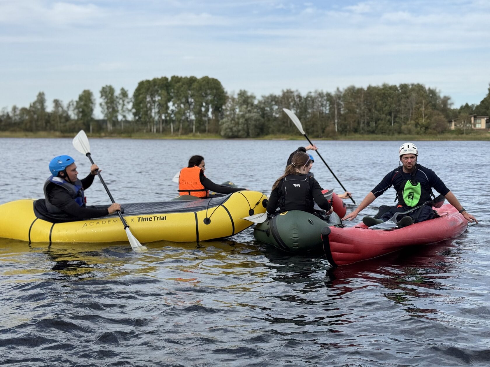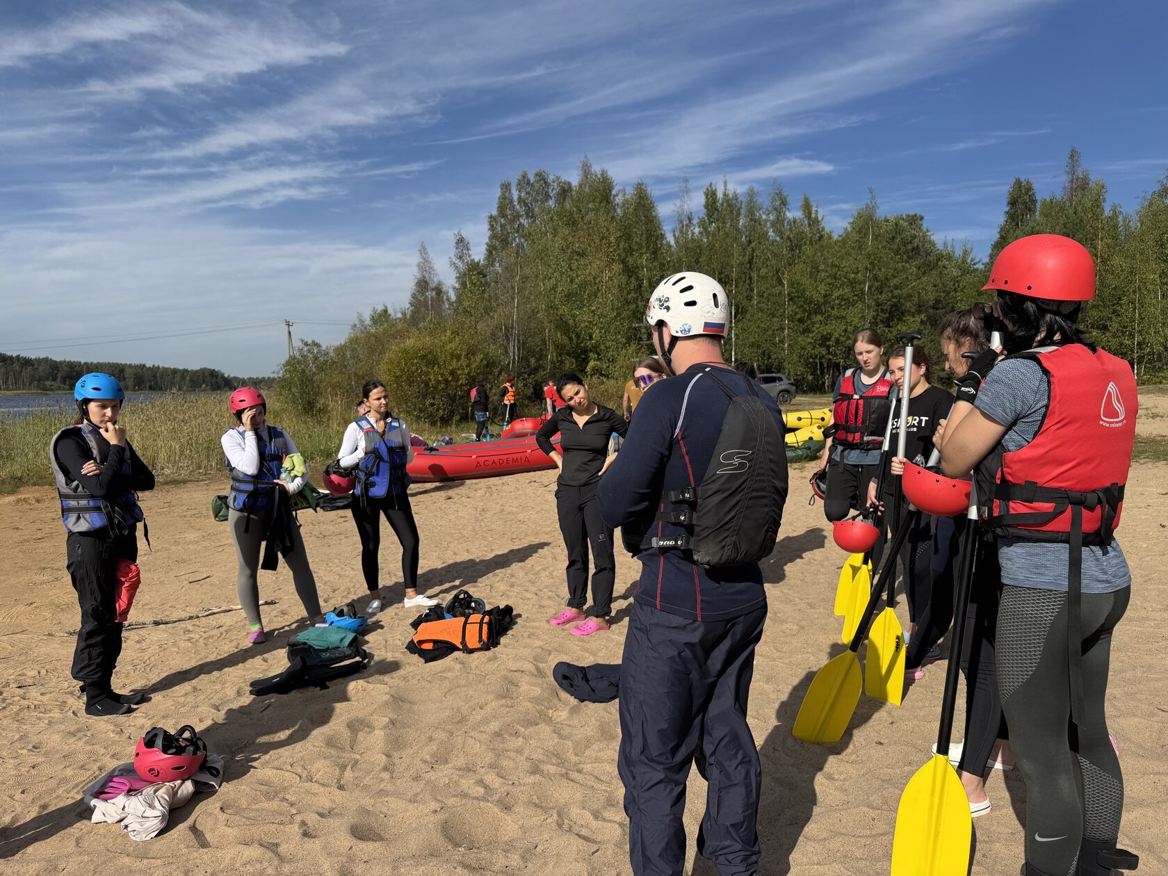 — Первое тренировочное занятие: отработка базовой техники гребли на спокойной воде, рассказ о нюансах работы на бурной воде, объяснение маршрута порогов